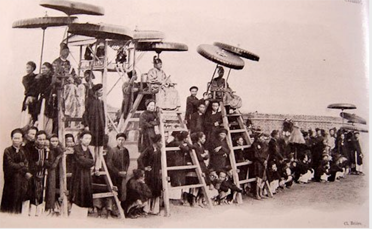 Tranh vẽ các vị quan trường thi xưa ngồi trên cao giám sát giúp người đọc hình dung về sự nghiêm mật nhưng vẫn có kẽ hở của hệ thống khoa cử xưa. (Ảnh minh họa: Le Petit Journal, 28/7/1895).