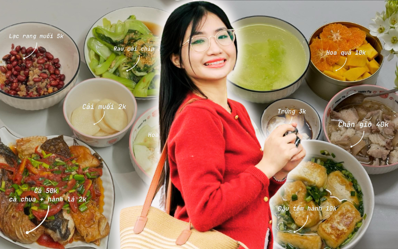 Mỹ Linh tính toán chi phí, mâm cơm thường gồm một món chính (thịt, cá) khoảng 50 - 55 nghìn đồng, món rau chỉ khoảng 5 nghìn đồng, và món tráng miệng 10 nghìn đồng. Chi phí mà cô nêu cho mỗi mâm chưa bao gồm tiền gạo (thường mang từ quê ra), gia vị, tiền điện nước.