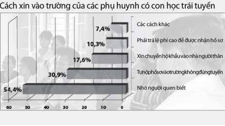 Và để con mình được học tại trường trái tuyến như mong muốn, 54,4% phụ huynh khi được hỏi đã thừa nhận mình có nhờ người quen biết “chạy” trường cho con. Trong khi đó, 30,9% phụ huynh khác cho biết mình “tự nộp hồ sơ vào trường không đúng tuyến”. Đáng lưu ý, cứ mười phụ huynh được hỏi thì có một người tiết lộ mình “phải trả lệ phí cao để được nhận hồ sơ” chạy trường cho con.
