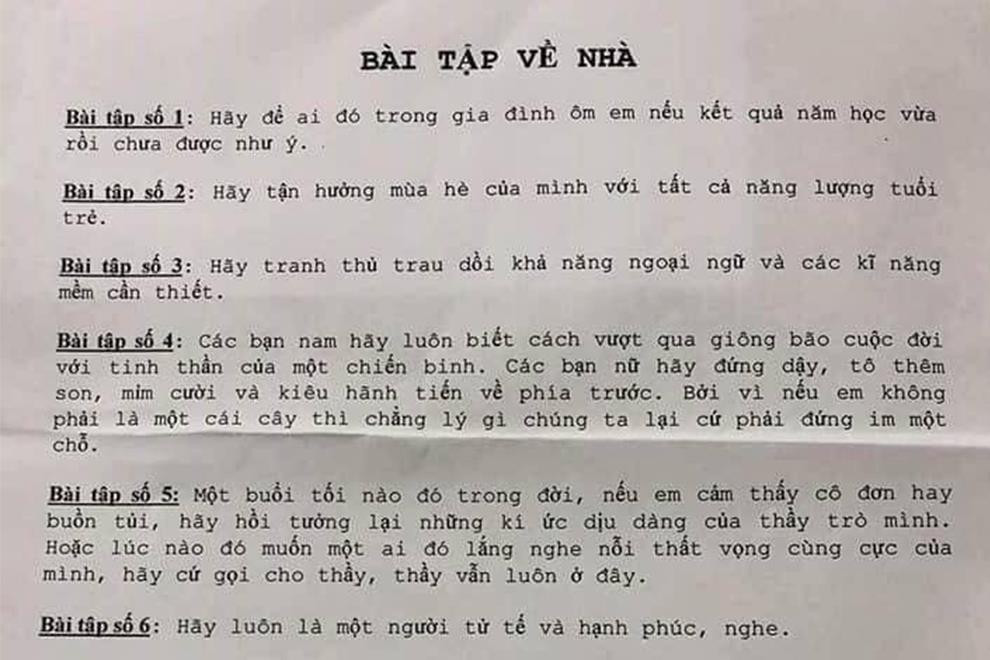 6 bài tập về nhà trên đang gây sốt mạng xã hội. Nhiều người xúc động trước tình cảm của thầy dạy Văn dành cho học trò. Bài tập về nhà không những không gây áp lực cho học sinh mà còn khiến các em cảm thấy ấm áp, tiếp thêm động lực cho các em.