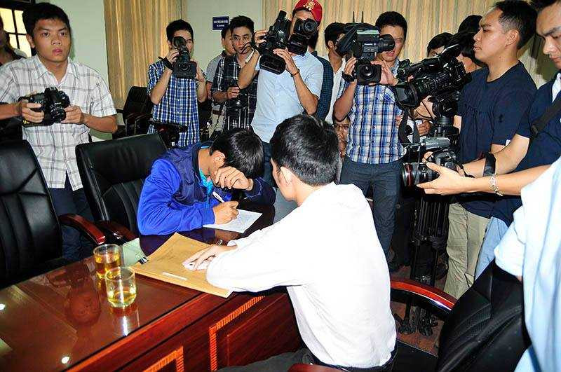 | Cầu thủ Đồng Nai che mặt viết tường trình tại cơ quan điều tra |