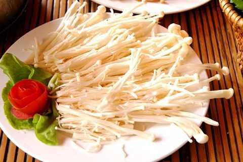 Nấm kim châm tươi 100 g, tôm nõn 50 g, gia vị lá cải thìa 20 g, nước dùng gà 750 g, dầu rán, dầu thơm, muối, mỳ chính, hành, gừng. Nấm kim châm bỏ gốc rửa sạch, lá cải thìa rửa sạch thái sơ. Cho dầu vào chảo đun nóng, đổ tôm nõn, hành, gừng, lá cải vào xào qua rồi đổ nước dùng gà vào cùng với nấm kim châm, muối đun sôi. Cuối cùng nêm mì chính, dầu thơm.