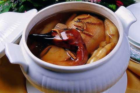 Vịt 1 con, đông trùng hạ thảo 10 g. Vịt làm sạch, đông trùng hạ thảo, gừng, hành cho trong bụng vịt khâu lại, cho muối tiêu, gia vị (thường thêm chút rượu), đặt trong nồi áp suất hoặc nồi cách thủy, thêm ít nước đun nhỏ lửa trong 2 giờ cho chín nhừ.