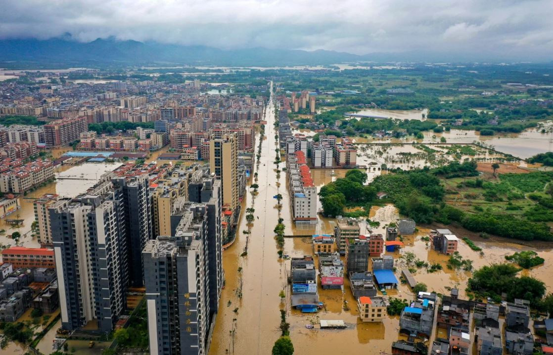 Thị trấn Hàm Quang ở thành phố Thanh Viễn, tỉnh Quảng Đông, Trung Quốc, chìm trong nước. (Ảnh: Tân Hoa Xã)