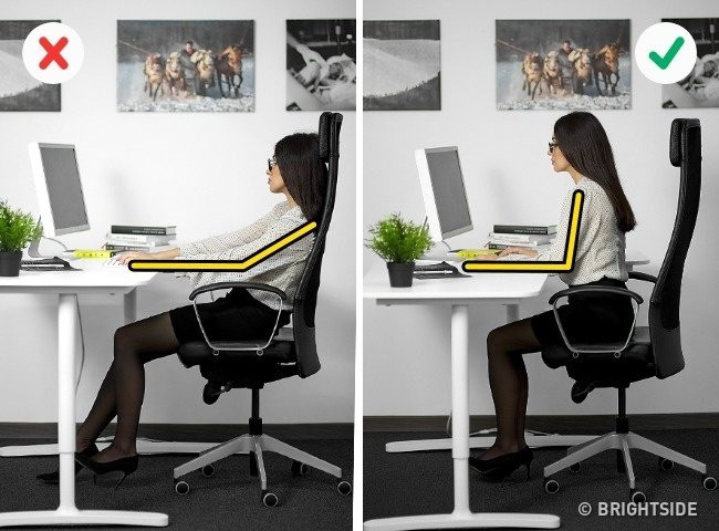 Để tránh đau vai gáy cổ, khi ngồi làm việc trước máy tính, chúng ta phải đặt mắt đúng vị trí chuẩn là ngang màn hình. Nếu để mắt thấp hơn, cơ thể sẽ phải trượt xuống ghế như hình bên trái, gây ảnh hưởng đến cột sống và lưu thông máu lên não. Nếu để cao hơn thì lưng uốn cong gây ảnh hưởng đến cột sống.