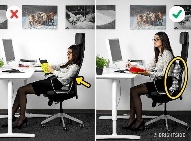 Độ sâu của ghế phải phù hợp với chiều dài hông của bạn. Nếu bạn ngồi trên chiếc ghế lòng sâu thì nên để một chiếc gối tựa đằng sau nữa cho vừa. Nếu không, lưng bạn sẽ bị trượt xuống như hình bên trái, điều này dẫn đến căng cơ và đau lưng.