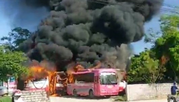 Vụ cháy không gây thiệt hại về người nhưng khiến 6 xe ô tô khách bị thiêu rụi.