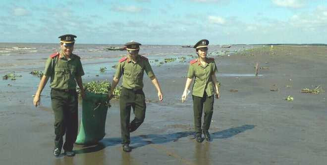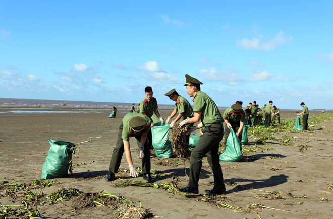 Hàng trăm người dân địa phương cũng tham gia làm sạch biển cùng các chiến sĩ công an, biên phòng trẻ
