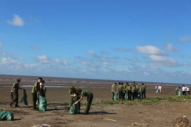 Trong lễ ra quân "Làm sạch môi trường biển" sáng 9/7, 600 đoàn thanh niên Học viện An ninh nhân dân, công an Nam Định, đội biên phòng tỉnh Nam Định, huyện đoàn Giao Thủy cùng hàng trăm ngư dân địa phương cùng nhau dọn sạch rác ở bãi biển Giao Thuỷ.