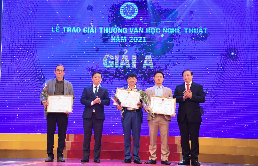 Ông Tạ Quang Đông, Thứ trưởng Bộ VHTT&DL và ông Trần Thanh Lâm, Phó trưởng Ban Tuyên giáo trung ương trao giải A cho 3 tác giả Lưu Vĩ Lân, Phạm Pa Ri, Phạm Văn Hòa.