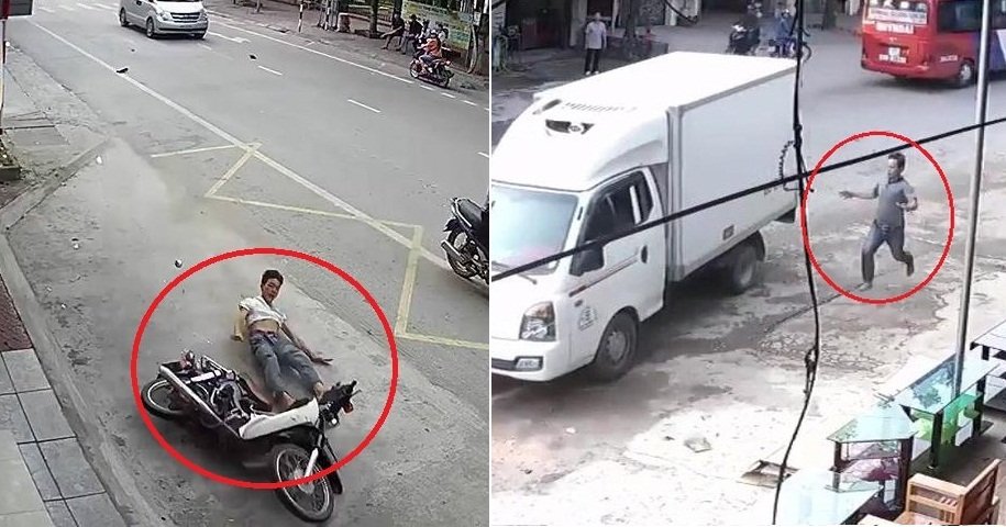 Người đàn ông sang đường không quan sát bị xe máy tông ngã, dép bay sang bên kia đường, một người dân gần đó tận tình giúp đỡ bằng cách ném trả lại chiếc dép nhưng cú ném không hoàn hảo như mong đợi.