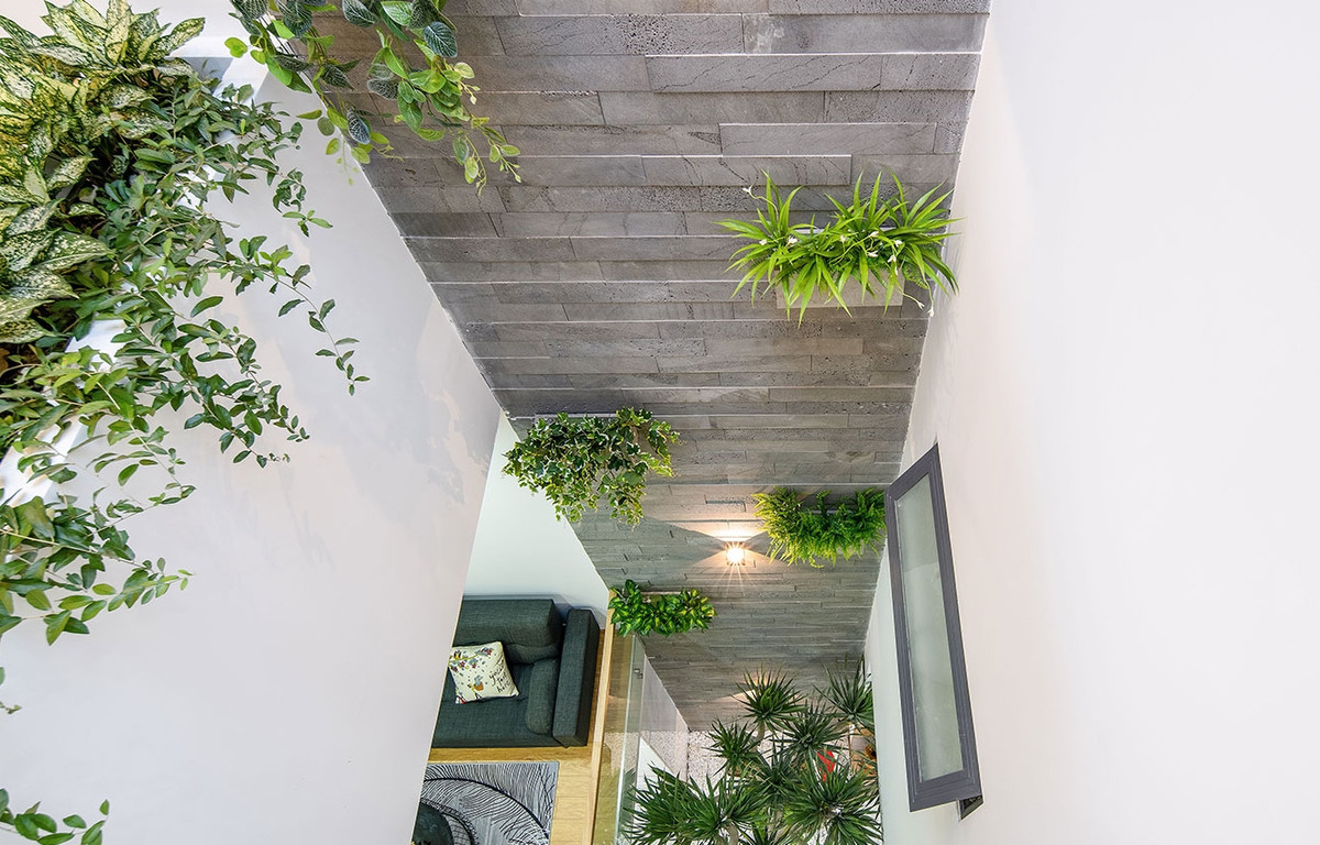 Với nhà ống có chiều dài lớn, thiết kế giếng trời ở giữa và cuối nhà giúp không khí luân chuyển liên tục, loại bỏ khí nóng và đưa luồng không khí tươi vào nhà.