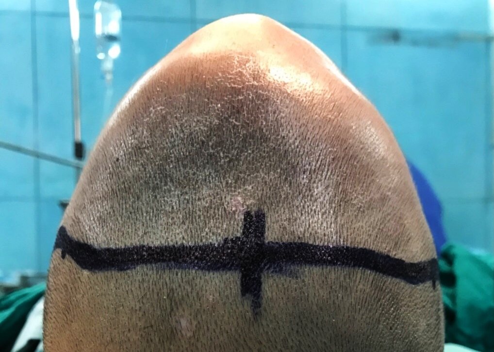 Bệnh nhi 20 tháng tuổi (quê Quảng Trị) bị dính khớp sọ vùng trán, làm hộp sọ không thể phát triển cân đối gây biến dạng đầu thành hình tam giác. Khai thác bệnh sử, tình trạng này của bé do bẩm sinh. Tuy nhiên, sau khi phẫu thuật thoát vị não và não úng thủy, hộp sọ của bé ngày càng biến dạng nặng.