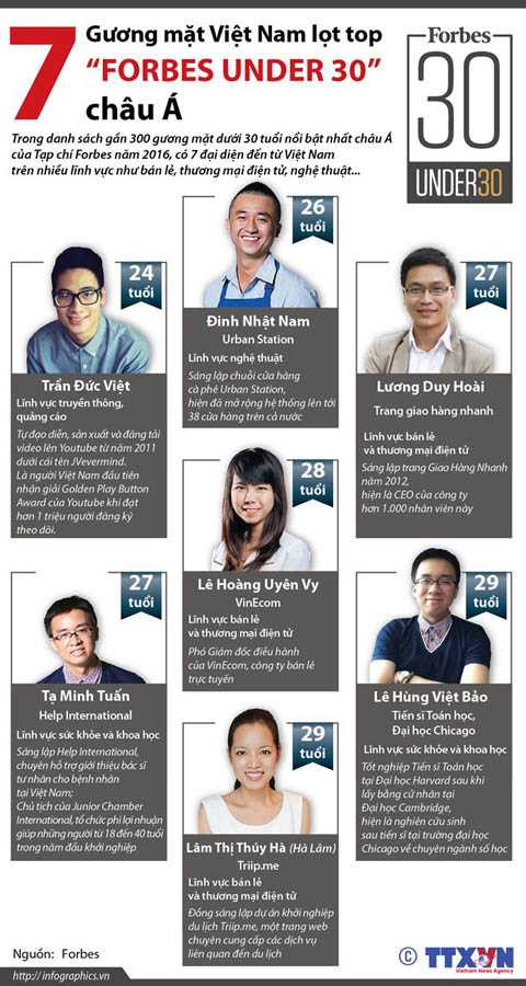 Trong danh sách gần 300 gương mặt dưới 30 tuổi nổi bật nhất châu Á của Tạp chí Forbes năm 2016, có 7 đại diện đến từ Việt Nam trên nhiều lĩnh vực.