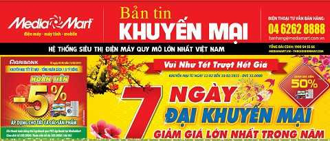 Diễn ra trong 7 ngày từ 12/2 đến hết 18/2, được tài trợ bởi các tập đoàn diện tử hàng đầu thế giới: Sony, Samsung, LG, Sharp… và các tổ chức tài chính ngân hàng uy tín: Vietinbank, Agribank, HSBC, ANZ…, Media Mart thực hiện“7 ngày đại khuyến mại” với tổng ngân sách giảm giá và tặng quà lên đến hàng tỷ đồng.