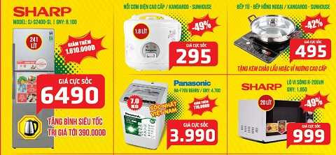 Cũng trong thời gian này khách hàng còn cơ hội “sắm” máy giặt, tủ lạnh, side by side giảm giá đến 50% tặngb bếp từ, bếp hồng ngoại, lò vi sóng, phiếu mua hàng 3 triệu đồng…. Một số model giảm giá sốc như: tủ lạnh Sharp 241l SJ-S7400-SL giảm 20% giá chỉ 6.490.000đ, máy giặt Panasonic 7.0kg NA-F70V B6HRV giá 3.990.000đ…