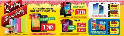 Chưa dừng ở đó, Media Mart luôn có nhiều chương trình khuyến mại, quà tặng hấp dẫn cho các sản phẩm kỹ thuật số, máy tính bảng nổi tiếng, được người dùng ưa chuộng, như máy tính bảng 7 inches đàm thoại/ chip lõi kép 1.3Ghz giá sốc 1.788.000đ tặng sim 3G tk lớn và gói combo trị giá 290.000đ, Samsung Galaxy Tab 4 chỉ từ 4.888.000đ tặng gói ưu đãi 1,2tr, sum 3G TK 11 triệu, túi đeo 190.000đ, thẻ nhớ 16G……