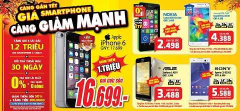 Đổi Smartphone vui tết, những chú dế sành điệu được giảm giá mạnh: iPhone 6 giảm thêm 1 triệu giá còn 16.699.000đ, Sony Xperia E3 giảm 1,8 triệu còn 3.188.000đ, Nokia Lumia 630 giảm 1 triệu còn 2.498.000đ…