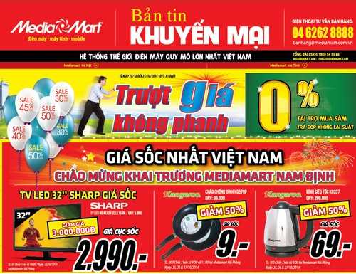 Đặc biệt chuẩn bị cho sự kiện chào mừng khai trương MediaMart Nam Định, MediaMart khởi động sớm với chương trình bán hàng giá cực sốc duy nhất trong 03 ngày 25,26,27/10 với chảo chống dính Kangaroo KG578P chỉ 9.000đ, bình siêu tốc Kangaroo KG337 chỉ 69.000 đồng, duy nhất ngày 25/10, TV LED Sharp 32’’ giá 2.990.000đ. Áp dụng duy nhất tại số 10 Lê Hồng Phong, Hải Phòng.