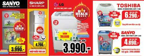 Với mức giảm giá sâu và tặng thêm quà giá trị, đây là thời điểm vàng để sắm cho cả gia đình nhưng chiếc tủ lạnh, máy giặt đời mới: tủ lạnh 123l Sanyo SR-125RN/SS giảm 720.000đ còn 3.990.000đ tặng khăn tắm trị giá 490.000đ, máy giặt 7.6kg LG WF-S7617MS giá sốc 3.990.000đ, máy giặt Sanyo 7.0kg ASW-F700Z1T chỉ 4.890.000đ tặng bình siêu tốc hoặc máy sấy tóc trị giá 390.000đ…