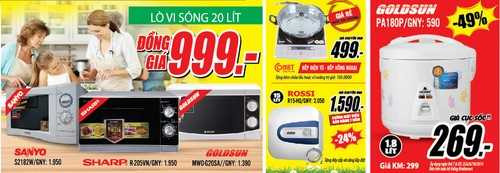 Gian hàng gia dụng mang đến loạt bom tấn khuyến mại: lò vi sóng 20l Sanyo S182W và Sharp R-205VN và Goldsun MWO-G20SA chỉ 999.000đ, bình nóng lạnh 15l Rossi R15-HQ chống giật điện, bảo hành 7 năm giá chỉ 1.590.000đ, nồi cơm điện Goldsun 1.8l PA180P giảm 49% giá 269.000 đồng…