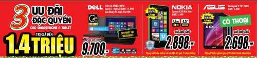 Trong 7 ngày cuối cùng Đại hạ giá, MediaMart áp dụng chính sách tặng thêm 7000 pin sạc dự phòng 10.000 MaH trị giá 899.000 đồng cho tất cả laptop. Laptop sinh viên Asus/ Dell/ Lenovo Haswell 2 nhân giá chỉ từ 4.890.000 đồng, Dell NS442-M4I324PW core i3 – 4005U giá ước tính sau trừ khuyến mại chỉ 9.7 triệu…