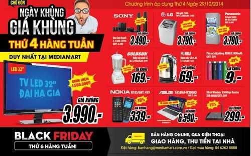 Theo đó, thứ 4 ngày 29/10, duy nhất tại MediaMart, TV LED 32’’ giảm 1.5 triệu còn 3.990.000 đồng, điện thoại Nokia N105 chỉ 339.000đ, pin sạc dự phòng Remax 2400 mAh còn 9000 đồng… Nếu chưa thực sự đủ “đã” với thứ 4 “ngày khủng giá khùng”, thì đừng bỏ qua Ngày thứ 6 siêu giảm giá - BlackFriday, dành riêng cho các tín độ săn hàng giá rẻ online http://mediamart.vn/blackfriday/ Xem chi tiết tại website http://MediaMart.vn; www.TheGioiDienMay.com hoặc liên hệ tổng đài chăm sóc khách hàng 1900 54 55 66 và tổng đài bán hàng qua điện thoại 04 6262 8888. Thông tin quảng cáo/ Nguồn: MediaMart