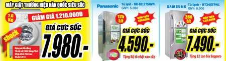 Một số sản phẩm điện lạnh “hấp dẫn” khác như: Tủ lạnh Panasonic 175l NR-PJ177SNVN giá cực sốc 4.590.000đ, Máy giặt lồng ngang LG WD8600 7kg giảm 1.210.000đ còn 7.980.000đ