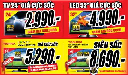 Đối với tất cả các trung tâm trên toàn hệ thống Media Mart, TV LED Full HD 40’’ Toshiba 40PB200 có giá chỉ 8.690.000đ tặng thùng bia Sapporo, TV LED 32’’ TCL L32F3380 giảm 800.000đ còn 4.990.000đ