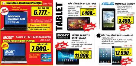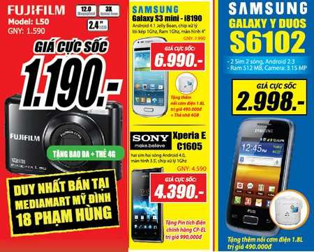 Trong 7 ngày vàng tới đây, khách hàng tiếp tục có chơ hội rinh về: ĐTDĐ Samsung Galaxy Y Dous S6102 giá 2.998.000đ tặng nồi cơm điện, Sony Xperia E C1605 giá 4.390.000đ tặng nồi cơm điện 490.000đ; máy ảnh KTS Fujifilm L50 giá 1.190.000đ tặng bao da, thẻ 4G.