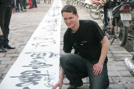 (VTC News)- Trong chiều qua 6/2, những du khách thăm quan Văn Miếu đã phải nán lại ngắm nhìn bức thư pháp dài gần 100m do 7 ông đồ ở đây thực hiện.