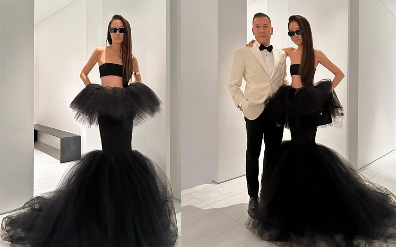 Vera Wang đã biến tấu chiếc áo quây ngực màu đen một cách hoàn hảo để làm nổi bật vùng ngực và bụng. Để trang phục được phù hợp, bà phối cùng với chiếc váy đen bồng bềnh và chiếc còng vàng dày ở bắp tay.
