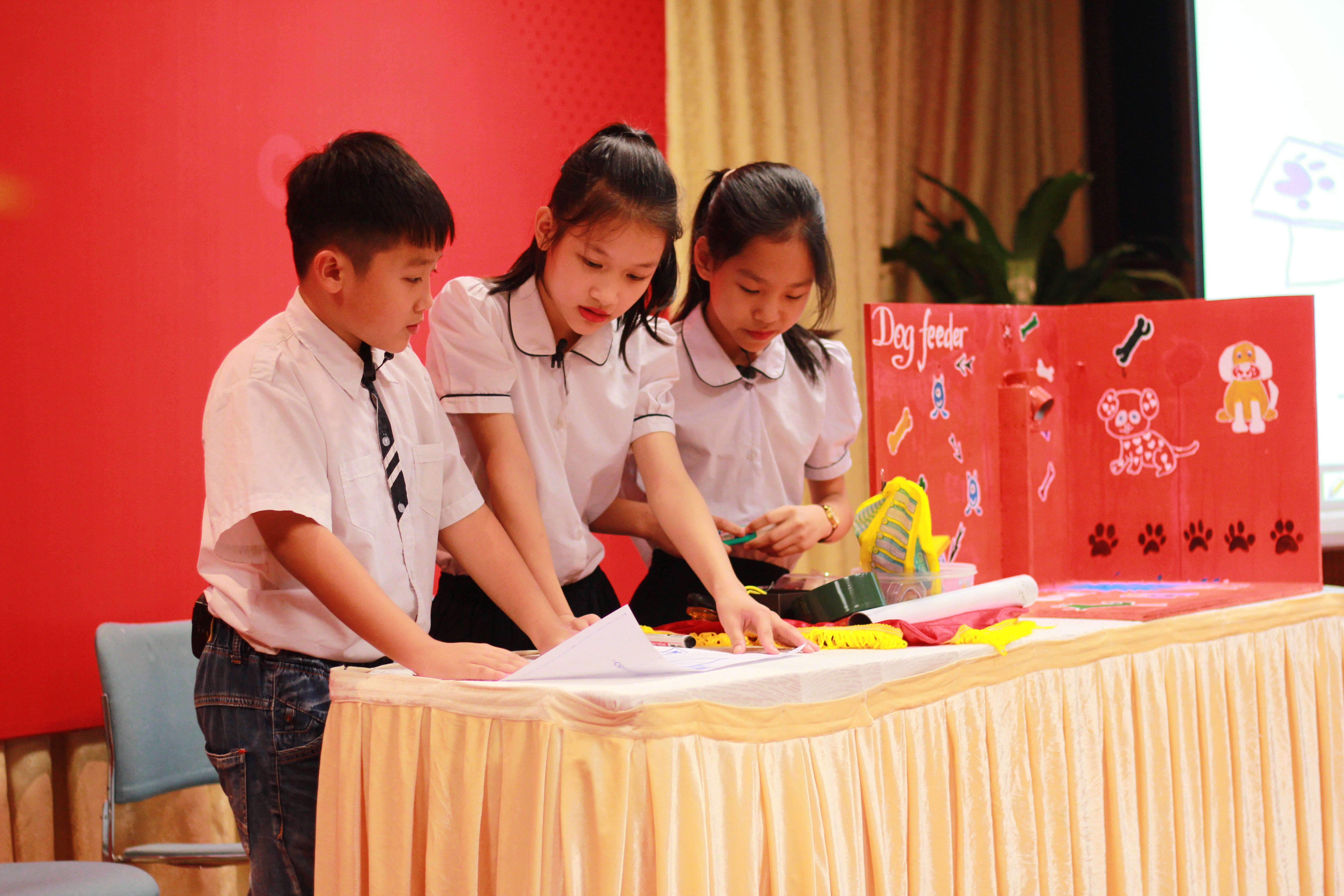 Trong khi đó, học sinh trường Tiểu học Tân Triều dạn dĩ thuyết trình sản phẩm sáng tạo STEM Dog Feeder (Máy đút thức ăn cho cún yêu) bằng tiếng Anh. Dự án giúp các em vừa phát triển vốn từ tiếng Anh chuyên ngành vật lí vừa khơi gợi tình yêu khoa học ứng dụng trong trẻ nhỏ.