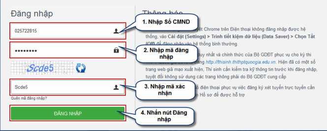 - Nhập các thông tin số CMND, mã đăng nhập, mã xác nhận và nhấn nút “Đăng nhập”.