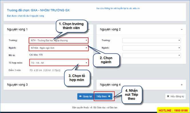 - Sau khi đã tìm kiếm được trường cần đăng ký, thí sinh chọn trường đó và nhấn nút “Tiếp” để chuyển sang bước tiếp theo.
