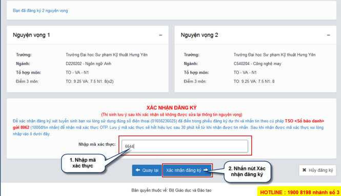 - Về việc nhận mã OTP: Đầu số 8062 không hỗ trợ cho số điện thoại của Gmobile và Vietnammobile. Thí sinh cần cập nhật về số của 1 trong 3 nhà mạng: Viettel, Vina, Mobile hoặc gọi đến tổng đài 1900 8198 theo số điện thoại đã đăng ký với điểm tiếp nhận để được cấp mã xác nhận.