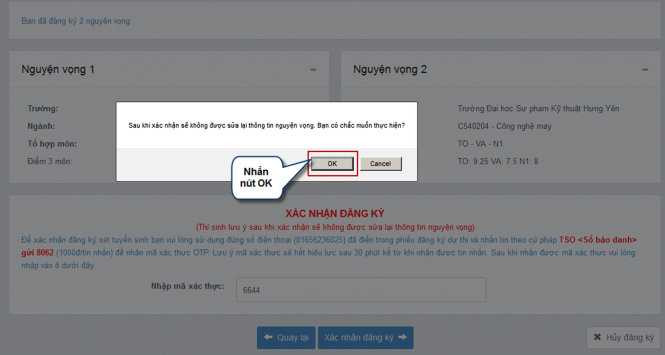 - Ngoài các bước chính liệt kê ở trên, sau mỗi bước mà thí sinh có thể mắc lỗi, hệ thống sẽ đưa ra các cảnh báo. Thí sinh cần đọc kỹ các cảnh báo này và khi đã yên tâm với lựa chọn của mình mới xác nhận để thực hiện bước tiếp theo;