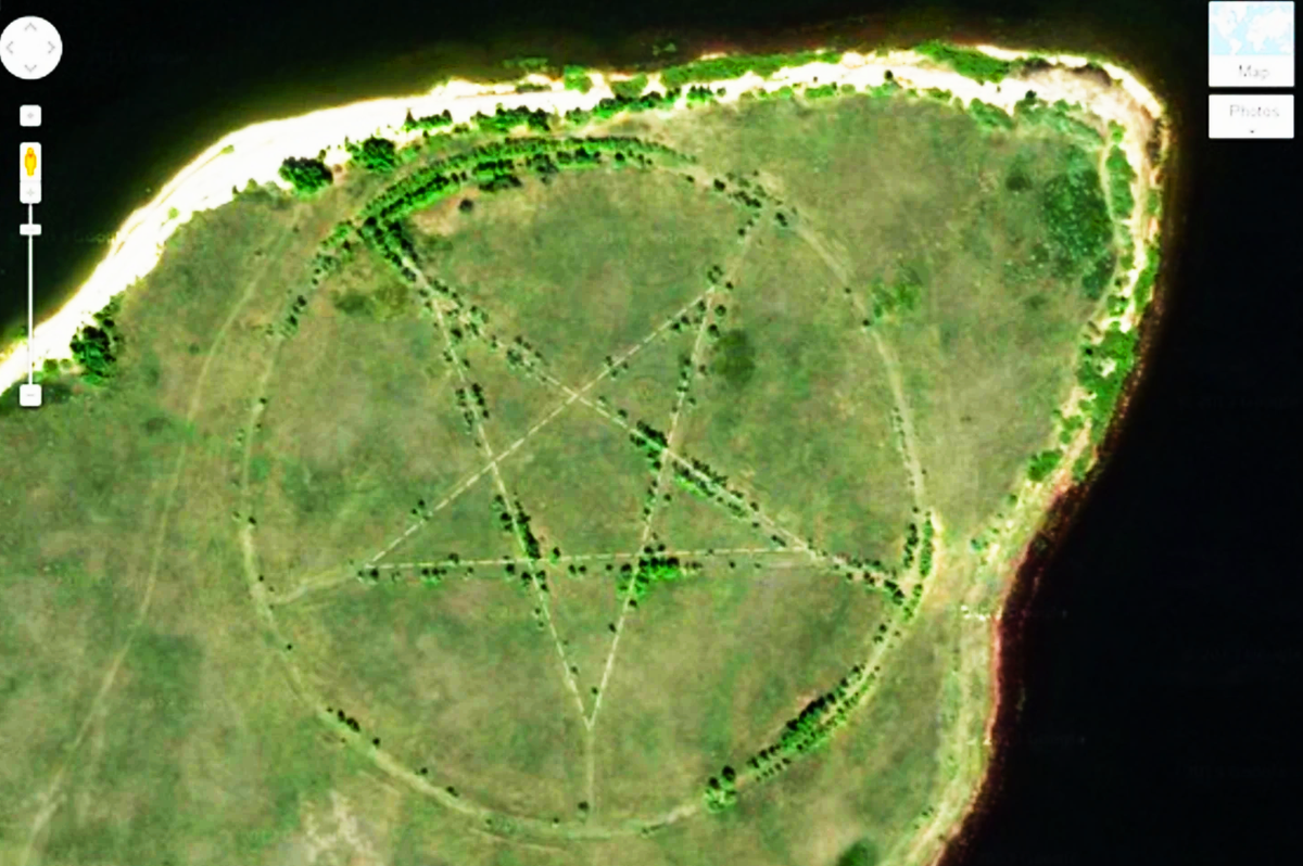 Trên thảo nguyên lộng gió ở Trung Á, ở một góc biệt lập của Kazakhstan, có một ngôi sao năm cánh lớn đường kính khoảng 366m, được bao quanh bởi một vòng tròn. Nhiều người cho rằng, nó có liên quan tới với việc thờ cúng ma quỷ, các giáo phái tôn giáo bất chính. Nhưng thực tế, hóa ra nó là đường viền của một công viên được tạo thành dưới dạng một ngôi sao; ngôi sao được đánh dấu bằng những con đường có hàng cây rợp bóng. (Ảnh: Google Earth)