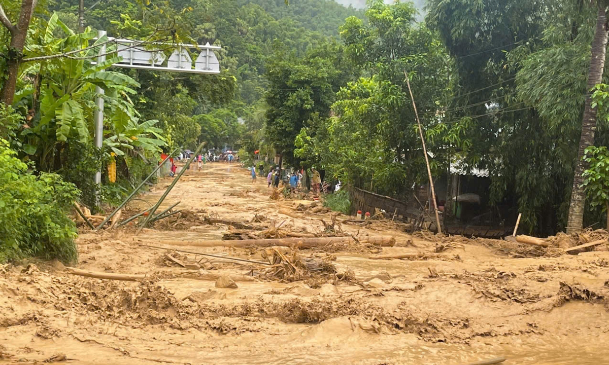 Nước lũ đổ về cuồn cuộn tại bản Na Nghịu, xã Sơn Điện, tỉnh Thanh Hóa. (Ảnh: Quỳnh Trâm)