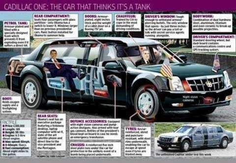 Dưới đây là 8 thực tế kinh ngạc về chiếc xe bọc thép nặng 8 tấn của Tổng thống Mỹ:1. "Quái vật" được bịt kín từ bên trong, cách ly hoàn toàn khỏi thế giới bên ngoài trong trường hợp xảy ra một cuộc tấn công sinh - hóa học. Còn có một tấm thép bên dưới xe để bảo vệ nó khỏi các cuộc đánh bom ven đường.2. Luôn có một nguồn cung máu trong xe phù hợp với nhóm máu của ông Barack Obama nếu Tổng thống Mỹ cần truyền máu khẩn cấp.3. Các súng bắn hơi cay và một camera nhìn xuyên màn đêm được lắp đặt ở phía trước xe. Chiếc Cadillac này còn được trang bị một khẩu súng Remington. 4. Ngăn hành lý chứa một hệ thống cung cấp ôxy riêng biệt và một hệ thống cứu hỏa thích ứng đặc biệt.5. Lốp xe có sức chịu đựng cao, có khả năng duy trì được tốc độ trên 100km/h dù đã bị bắn thủng. "Quái vật" cũng có thể thoát được một cuộc tấn công ngay cả khi bánh xe bị thổi văng đi.6. Cửa xe nặng bằng cửa cabin Boeing-757 và dày hơn 20cm.7. Thân xe được làm bằng aluminium, titanium, thép cứng và ceramic.8. Bình nhiên liệu được bọc bọt biển và bọc sắt để tránh cháy nổ khi bị va chạm trực tiếp. Theo Thanh Thảo/ Vnn
