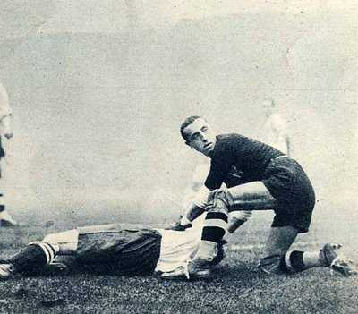 Trận đấu hấp dẫn ngay từ phút đầu tiên khi Drake bị đốn ngã trong vòng cấm và trọng tài cho Tam sư được hưởng quả penalty, nhưng Brook đã không thể thắng được thủ thành Ceresoli trên chấm 11m sau đó. Phút thứ 2, Luis Monti bên phía Italia …gãy chân sau một pha va chạm cực mạnh với Drake và buộc phải rời sân. Thời đó chưa có luật thay đổi người như bây giờ, và đội khách phải chơi với 10 người trong suốt phần còn lại của trận đấu. Đó cũng là thời điểm những pha trả đũa bạo lực giữa 2 bên bắt đầu.