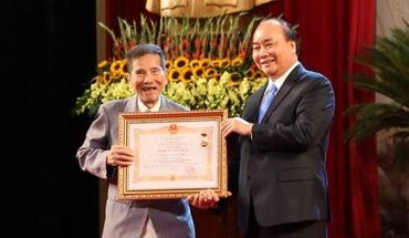 Nam diễn viên gạo cội được Thủ tướng Nguyễn Xuân Phúc trao tặng danh hiệu NSND và chúc mừng.