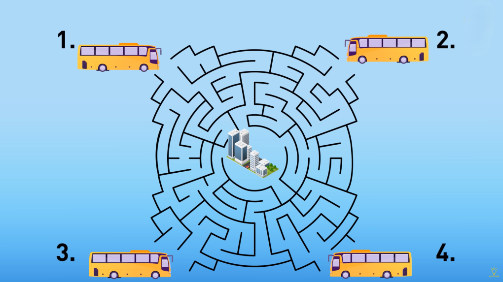 Có 4 chiếc ô tô chở khách đi từ 4 hướng khác nhau để vào trung tâm thành phố. Tuy nhiên, con đường đi tới thành phố rất quanh co và có thể đi vào nhiều cung đường ngõ cụt. Bạn hãy tính toán xem một trong 4 chiếc ô tô nào dưới đây sẽ đến được trung tâm thành phố mà không phải đi qua các ngõ cụt.