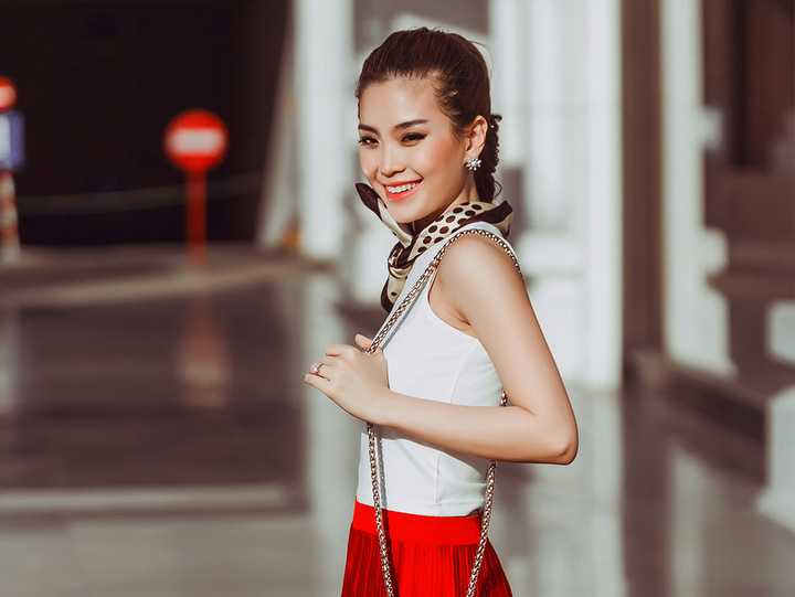 | Á hậu họ Nguyễn “thắp sáng” đường phố bằng hai màu trắng – đỏ, chân váy ôm giúp Diễm Trang khoe được đường cong gợi cảm nhờ luyện tập thể thao đều đặn. Cô sử dụng những phụ kiện tinh tế như bông tai, nhẫn kim cương. |