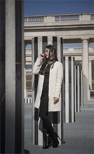 Diễm Trang tự làm stylist cho chính mình với áo khoác dài phối cùng giày bốt, mũ, kính, vòng cổ ngọc trai và túi hiệu Louis Vuitton.
