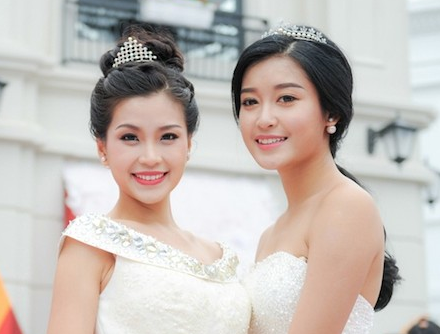 Đây là lần đầu tiên Á hậu 1 và Á hậu 2 có dịp hội ngộ kể từ sau cuộc thi Hoa hậu Việt Nam 2014. Hai người đẹp không hẹn mà cùng diện bộ đầm màu trắng, phong cách công chúa tuyết yêu kiều. Á hậu Huyền My có phần gợi cảm hơn với thiết kế cúp ngực khoe vai trần cuốn hút.
