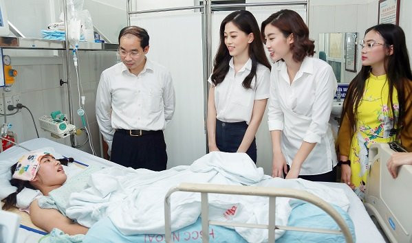 Trong chuyến từ thiện tại bệnh viện lần này còn có sự góp mặt của Hoa hậu Đỗ Mỹ Linh và Á hậu Thanh Tú. Diện trang phục giản dị và rất thân thiện, 3 người đẹp nhận được nhiều sự yêu mến của các em bé có mặt tại đây.