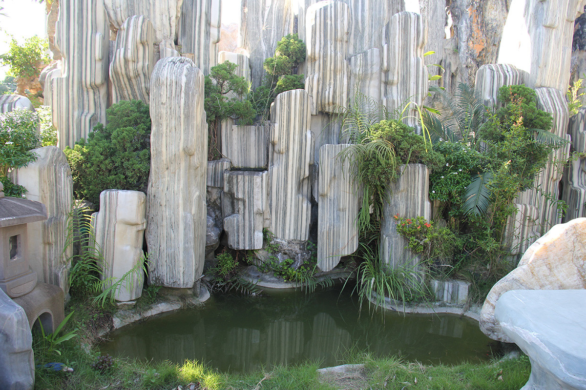 Hòn non bộ khủng có chiều cao hơn 5m, chiều rộng hơn 7m được chế tác từ các loại đá xanh, đá đen và đá tuyết sơn của cơ sở đá mỹ nghệ Duy Hiển được định giá lên đến gần 500 triệu đồng.