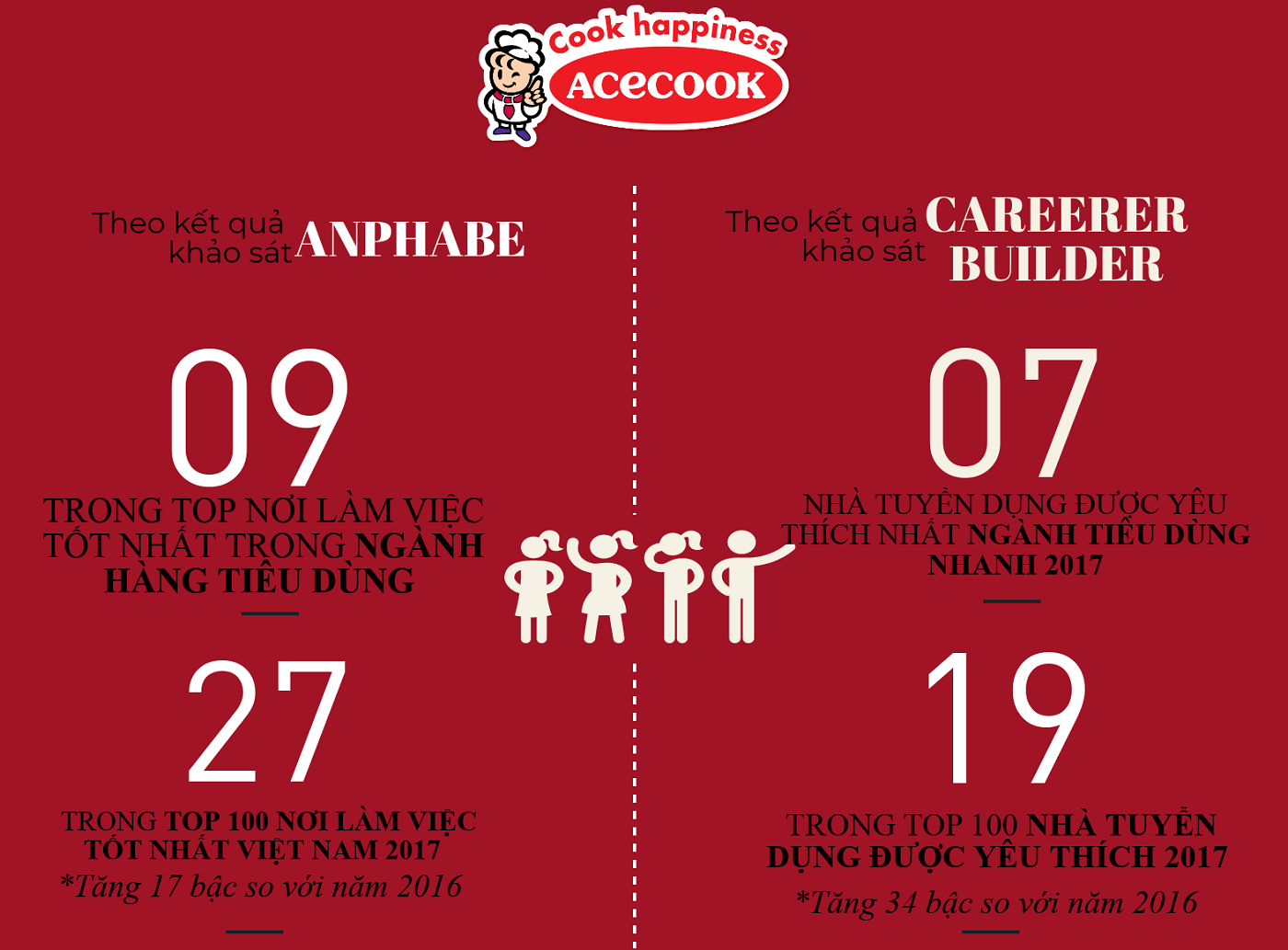 Bên cạnh đó, trong một cuộc khảo sát độc lập khác về Top 100 Nhà tuyển dụng được yêu thích 2017 do CareerBuilder - Mạng Việc làm & Tuyển dụng lớn nhất thế giới thực hiện, Acecook Việt Nam cũng chính thức được vinh danh đứng vị trí thứ 19 của cuộc khảo sát này, tăng 34 bậc so với năm 2016. Không dừng lại ở đó, Acecook Việt Nam tiếp tục đạt Top 7 Nhà tuyển dụng được yêu thích nhất Ngành tiêu dùng nhanh 2017.