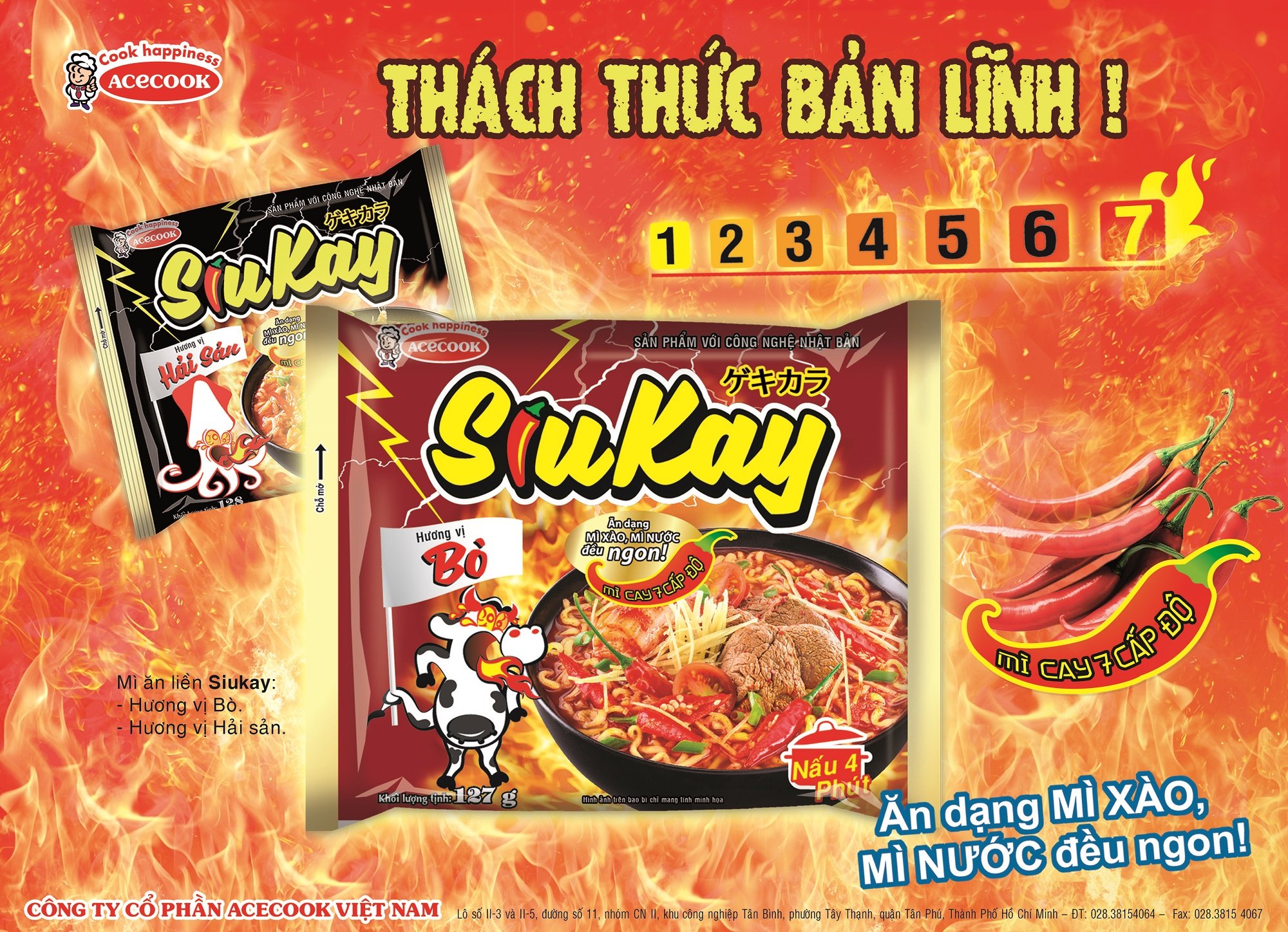 Sản phẩm là sự kết hợp tuyệt vời của nước súp vị bò ngon ngọt đậm đà và vị cay nồng của ớt thẩm thấu tận sâu vào bên trong sợi mì khiến bạn thăng hoa với độ cay xé lưỡi và sau đó là cảm giác khoan khoái vượt qua nỗi đau ngọt ngào. Sản phẩm có gói ớt riêng giúp bạn có thể điều chỉnh mức độ cay theo ý thích. Nếu bạn là người bản lĩnh, thích trải nghiệm thử thách mì cay cấp độ 7 thì hãy sử dụng hết gói ớt.